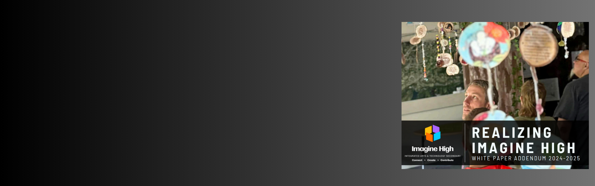 Imagine High is a full service public school of choice for grades 9-12 focused on Integrated art & technology through project-based learning. Students graduate with standard BC Dogwood Diploma. Learning moves through interdisciplinary projects with content from multiple subject areas. Out approach is rooted in the four pillars of Integrated Disciplines, Authentic Learning, Collaborative Culture & Visionary staff.